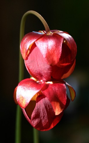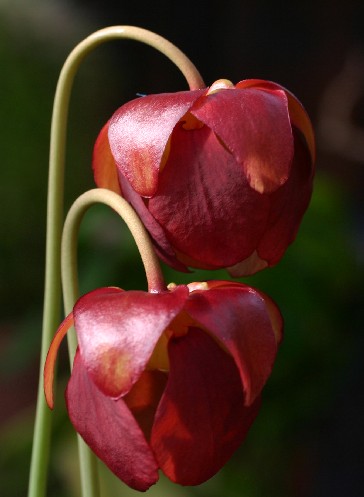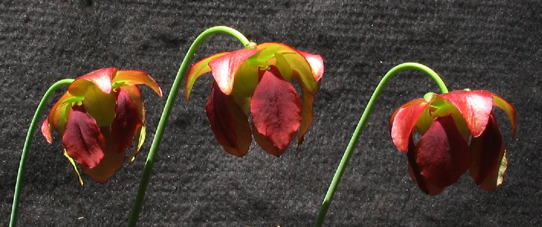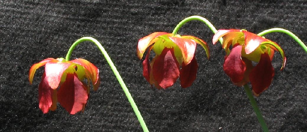 The ICPS database states: "This plant ... is a very vigorous grower. Its outstanding features are best noted in the late season, autumnal leaves which are unmistakable. (Early season leaves show much less pronounced features.) This plant is particularly notable for the upright, pubescent leaves, which together with the bright coloration of yellow gold and numerous areolae a{/n}d bright red venation throughout. Most striking is the elongated, flattened, and somewhat downwards pointing hood. The plant is overall quite compact, since the pitchers are usually 10-20cm (4-8 inches) in length. The flower petals are deep red, and contrast nicely with the bright golden pitcher leaves."
