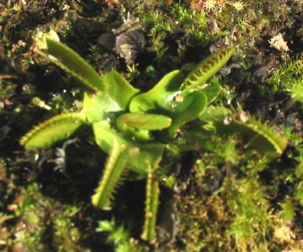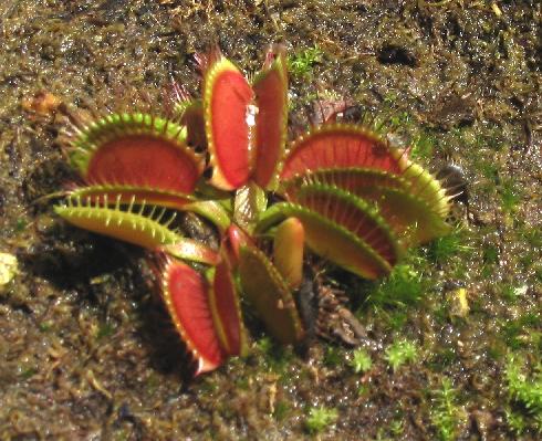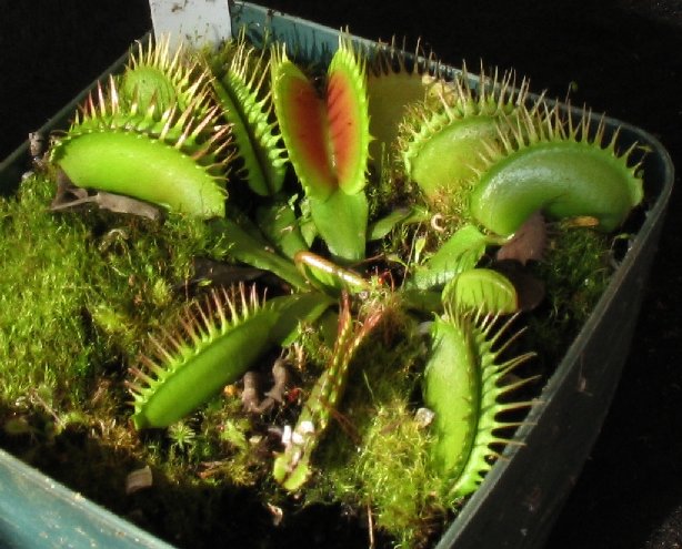 According to Alexis Vallance, U.K., "Fine Tooth + Red" is a cross between a sawtooth and some sort of reddish VFT. The resulting selected plant has teeth which are fairly triangular, like extended shark's teeth.